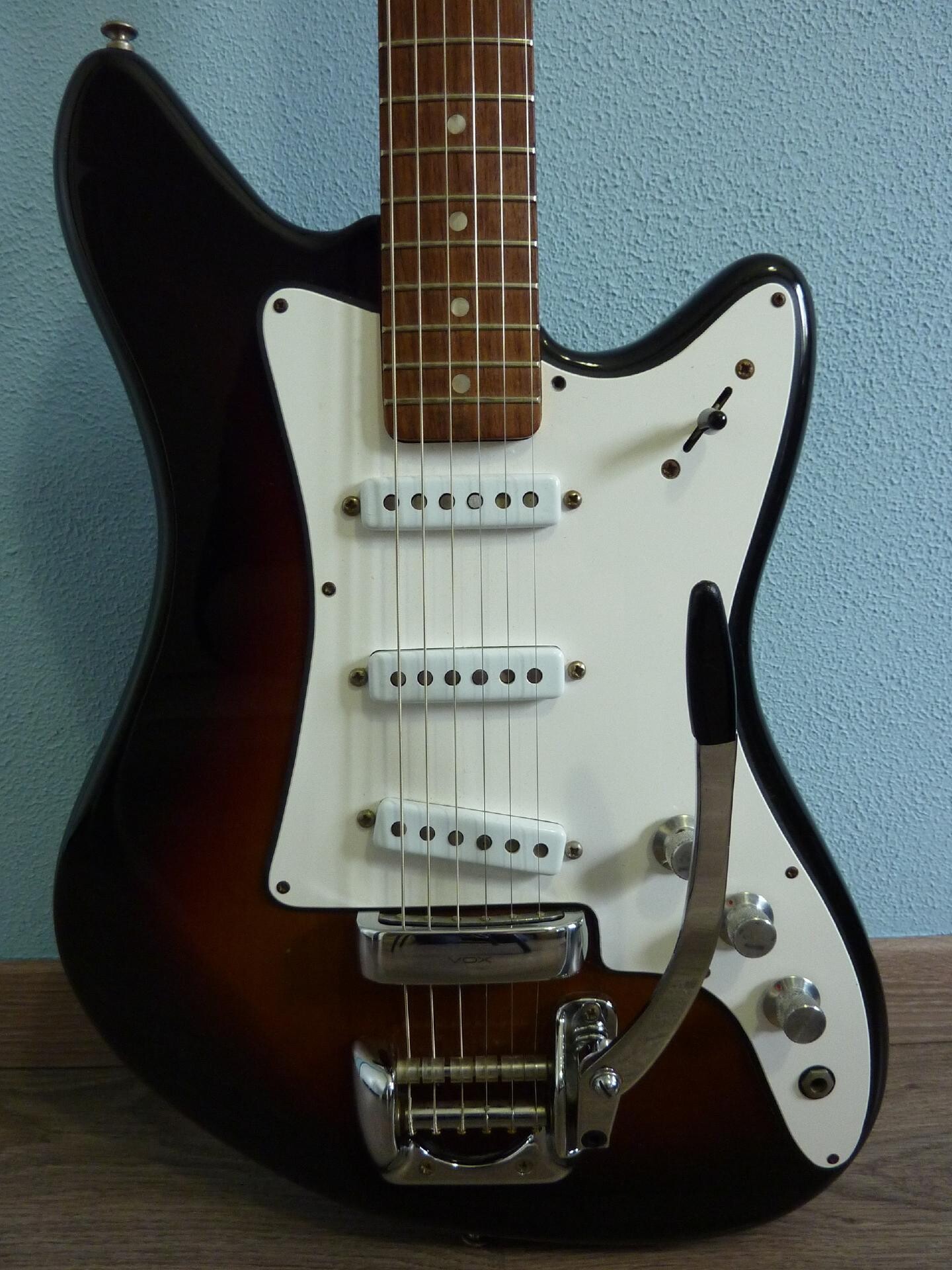 Electronics are all in solid working condition. 3 Vox VII single coil pickups, three position pickup selector switch, a volume control and two tone controls. The neck is nice and straight and the action is low and comfortable. Frets have no wear at all. As with every vintage guitar you have to adjust it to your personal taste.